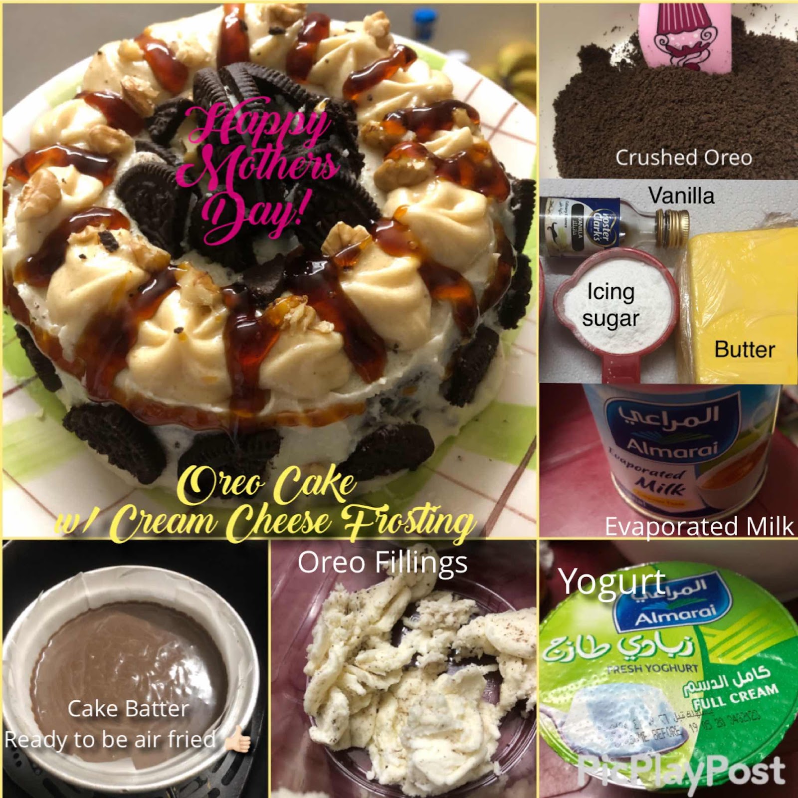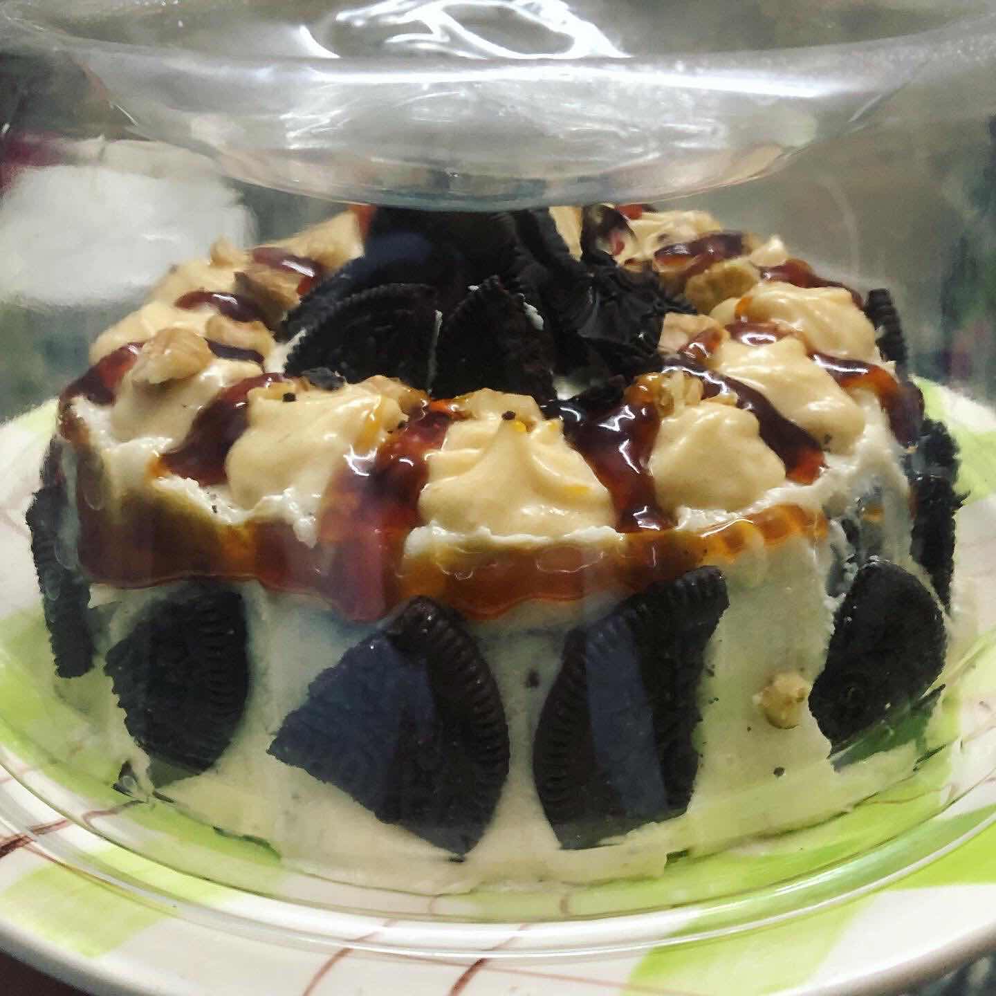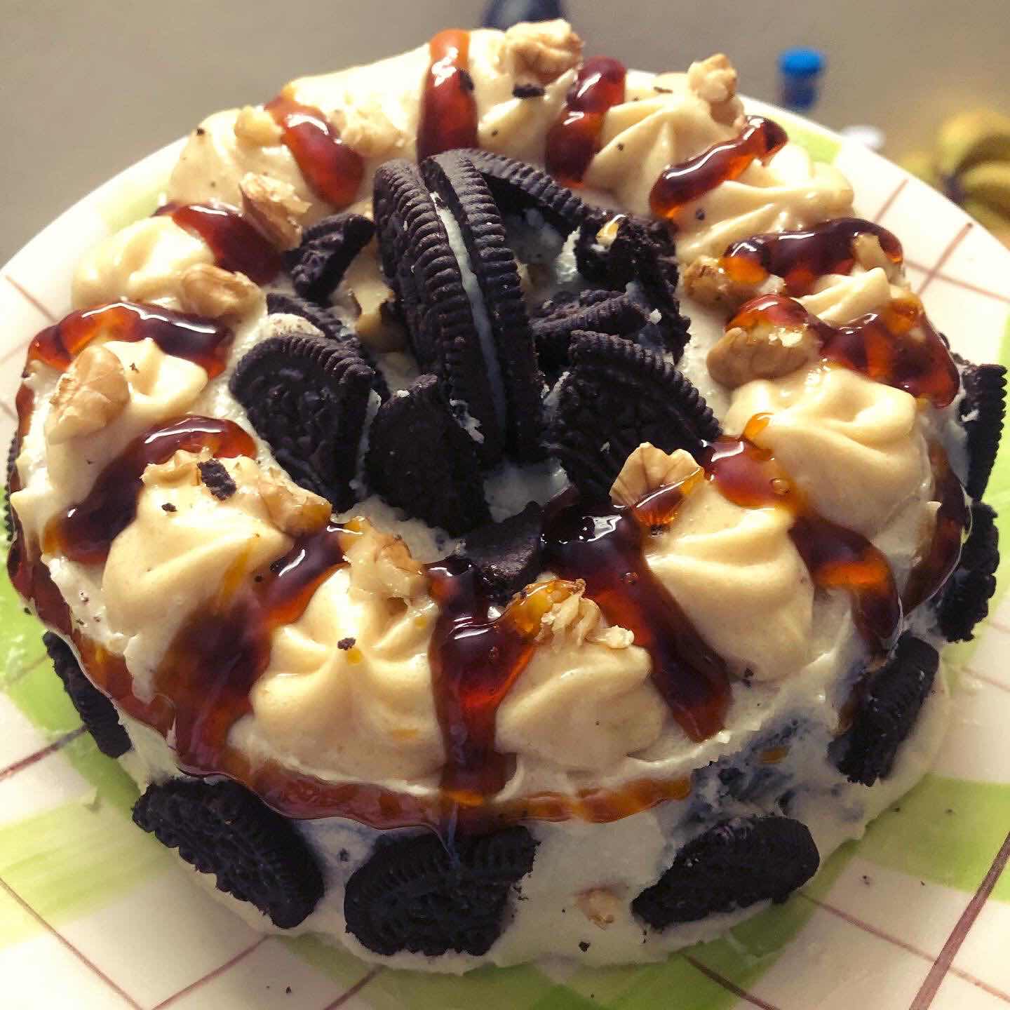 - On the remaining cream cheese put 2 table spoon of caramel sauce and mix it, then pipe on top of the cake to decorate. Put some broken oreos on top as you want.