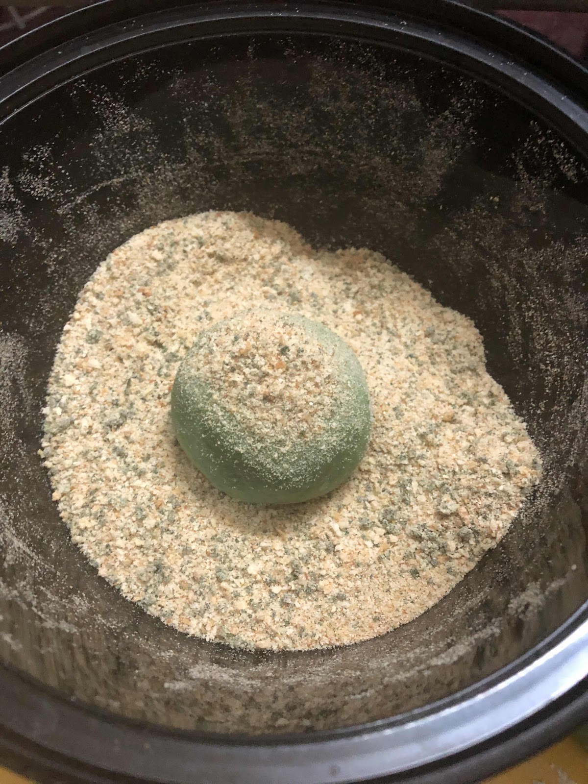 - Add the egg, milk, and the pandan flavor (food color), mix together until you form a dough or use your hand to mix it.